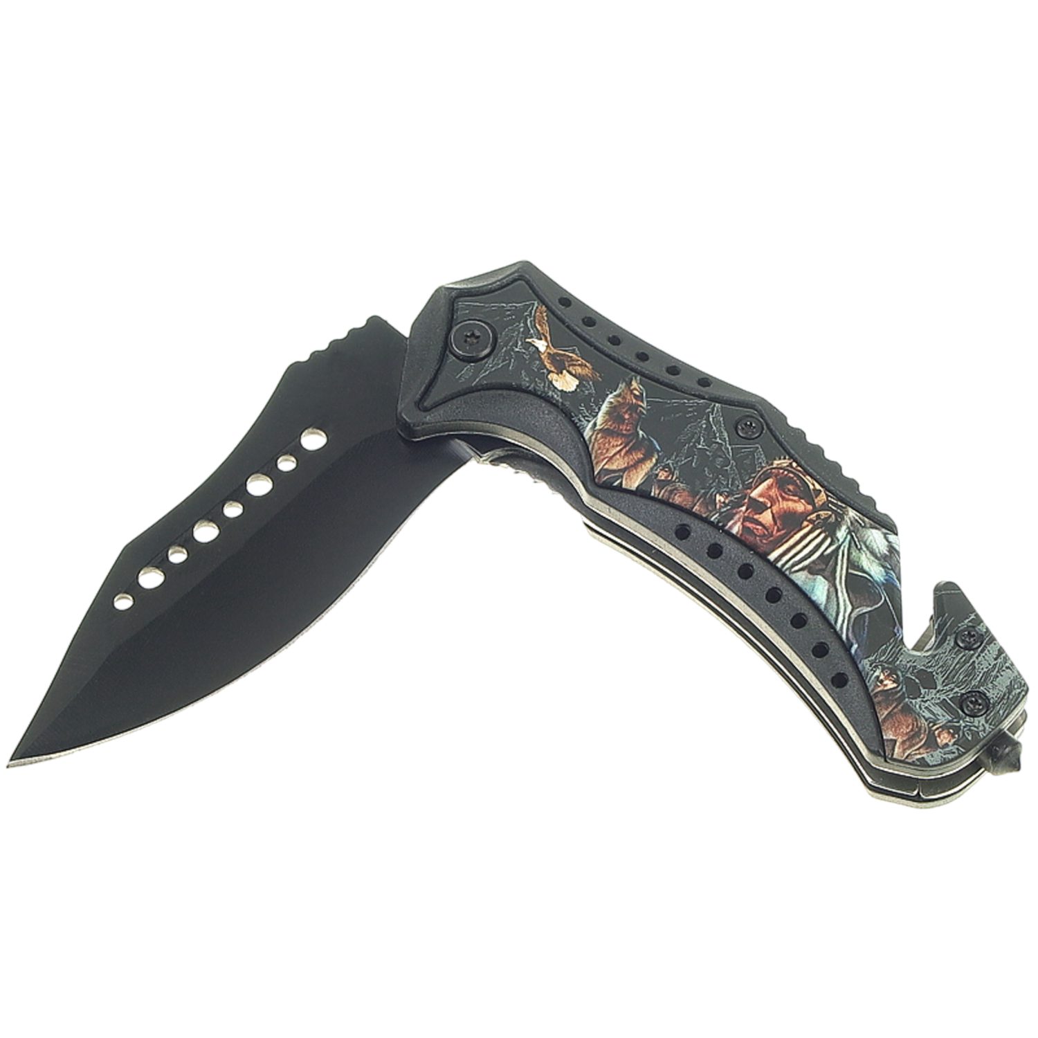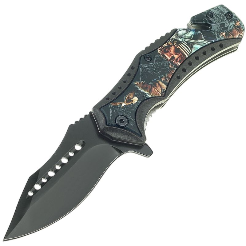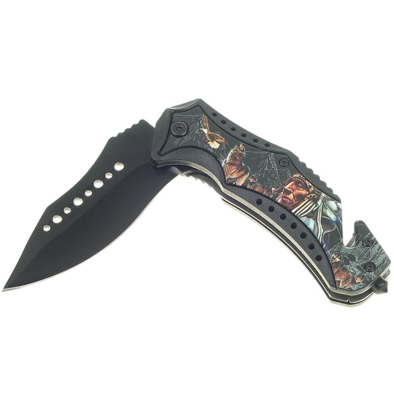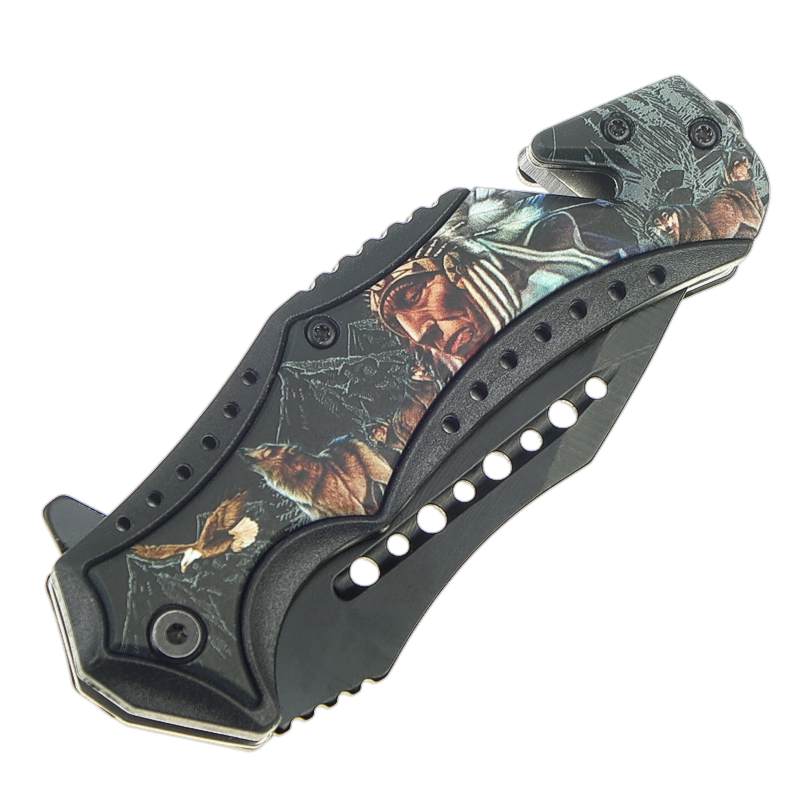 Radi by ste si zaradili nový vkusný vreckový nôž, ktorý v exteriéri či interiéri využijete ako nápomocný záchranársky nožík? V takomto prípade je tu záchranársky nožík Indián so sympatickým designom a motívom indiána na rukoväti noža. Tento skladací nôž sa môže chváliť rozličnými záchranárskymi pomôckami, ktoré sa vám zídu v prípadoch, kedy je nutné precízne rozbiť sklo či rozrezať tvrdý materiál. Na podobné situácie je tento nôž kvalitne pripravený, keďže disponuje úderníkom na sklo, viacúčelovou čepeľou či kovovou sponou na pripevnenie nožíka na opasok. Čepeľ nožíka bola vytvorený z prvotriednej nerezovej ocele typu 420, ktorá bola natretá čiernym ochranným náterom, aby sa zamedzilo vzniku korózie. Vďaka ergonomickej rukoväti nôž perfektne padne do ruky a poskytne tak pohodlný úchop, ako aj efektívnú prácu s nožom. Ak teda zháňate štýlový nôž do exteriéru, alebo ste milovníkmi indiánskej kultúry, tento skladací nôž je stvorený ako pre vás.
