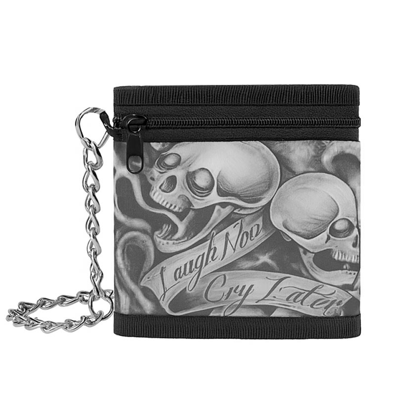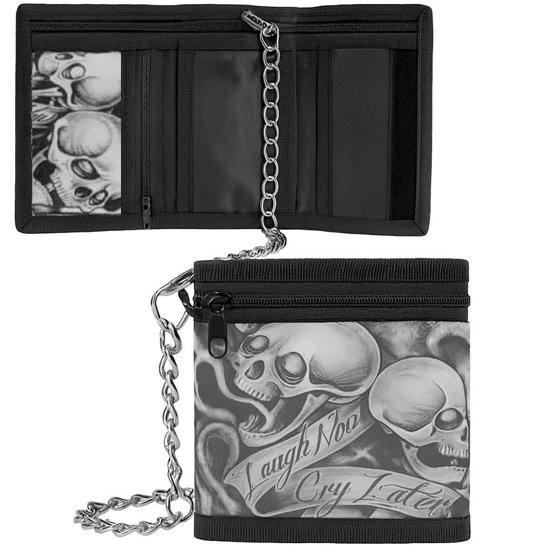 špecifikácia: praktická čierna nylonová peňaženka na suchý zips s motívom lebiek a nápisom"smejte sa, plačte neskôr" s retiazkou a karabínkou