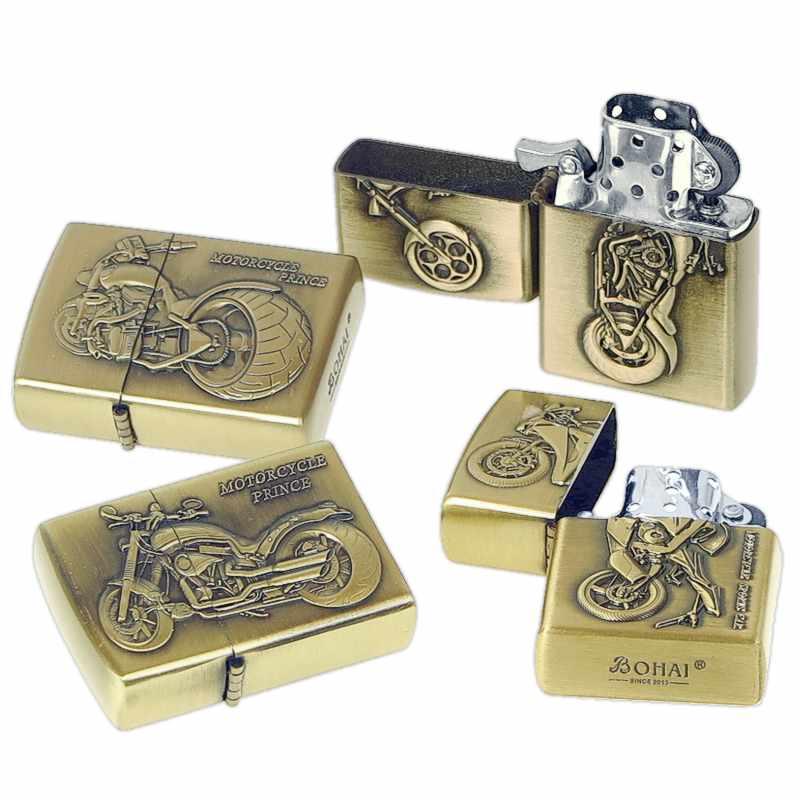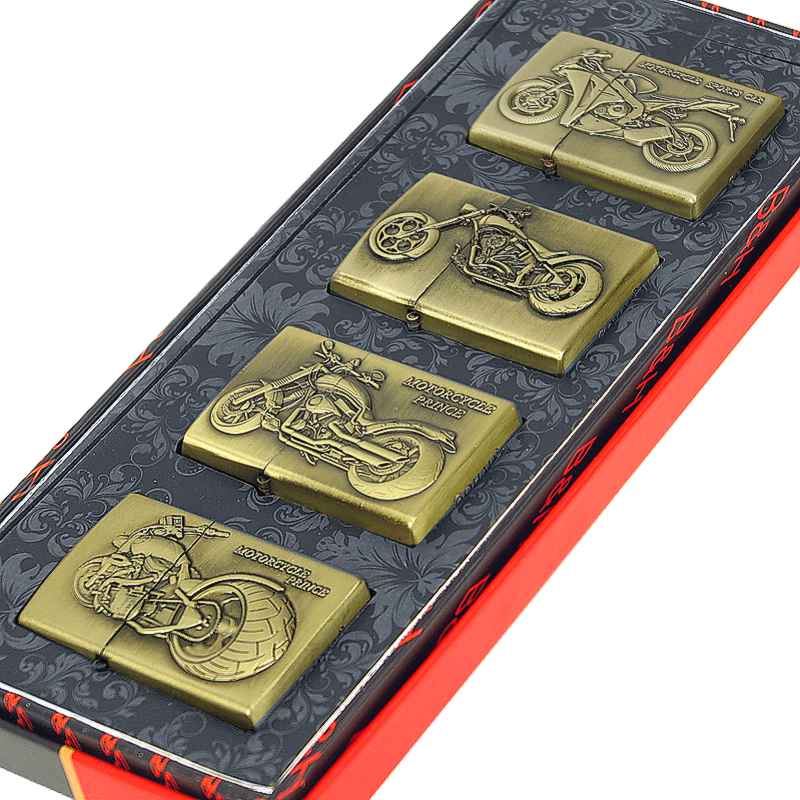 špecifikácia: Darčeková kazeta so štyrmi kusmi kovových benzínových retro zapaľovačov s emblémom motocyklov je skvelý darček pre muža motorkára.