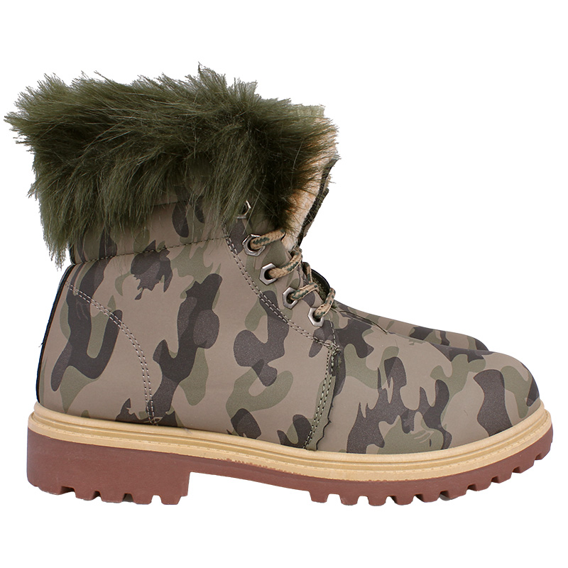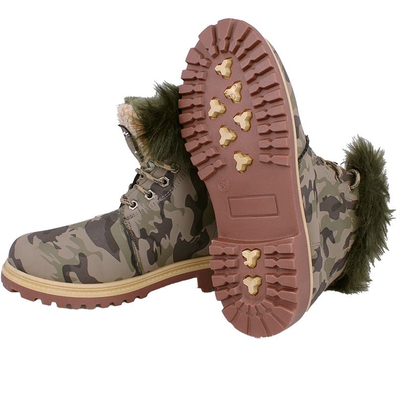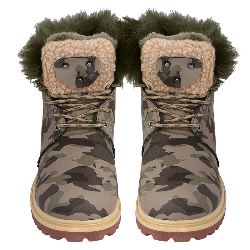 Dámske topánky na zimu v maskáčovom prevedení so šnurovaním. Zvnútra sú zateplené hebkou kožušinou vďaka čomu sú tieto dámske zimné topánky ideálne do chladného počasia, do prírody a pod. Podrážka je tvorená kvalitným polyuretánom, ktorý sa vyznačuje odolnosti voči nárazom, šmyku alebo oleju. Jemná kožušinka vo vnútri obuvi zasa príjemne hreje aj počas mrazivého počasia.