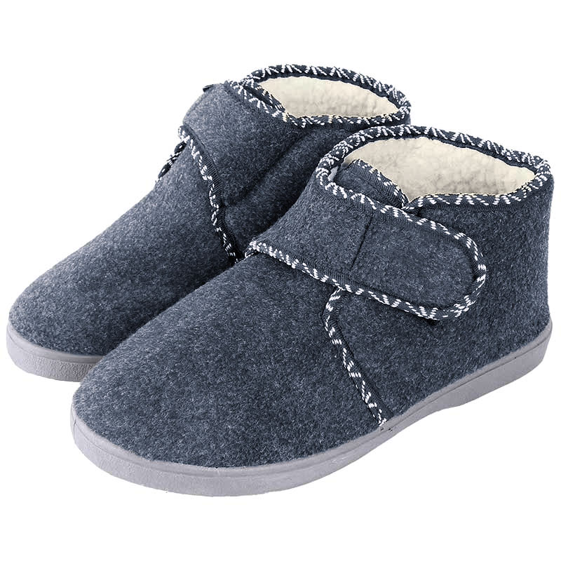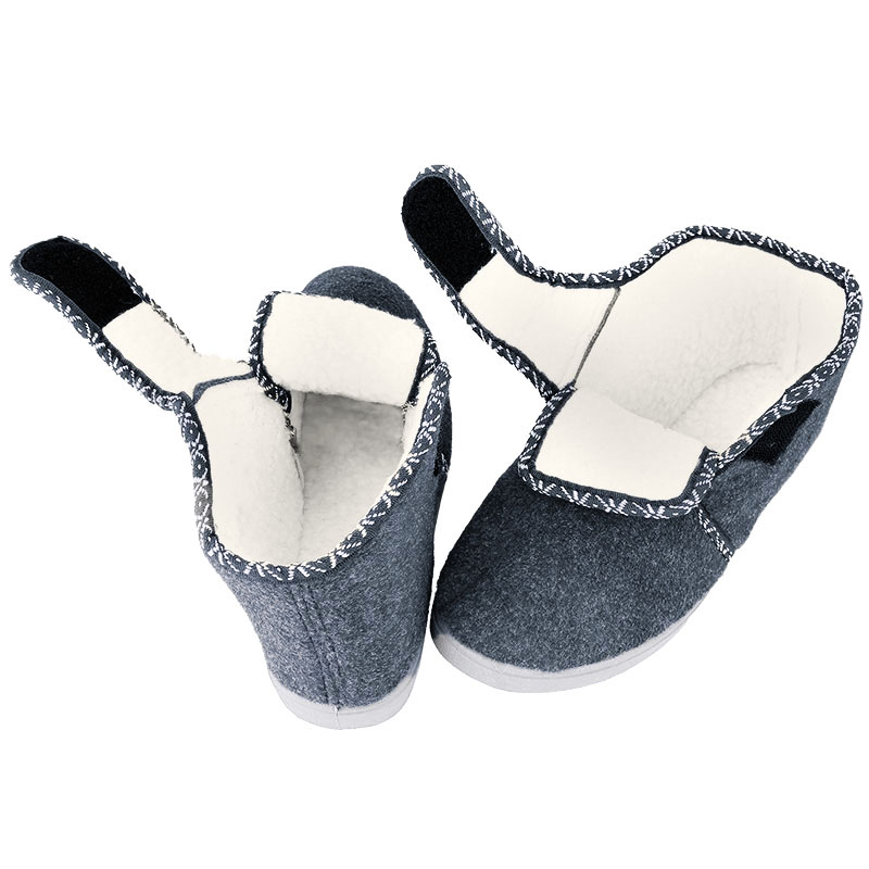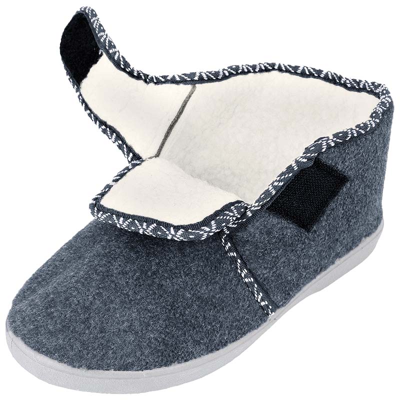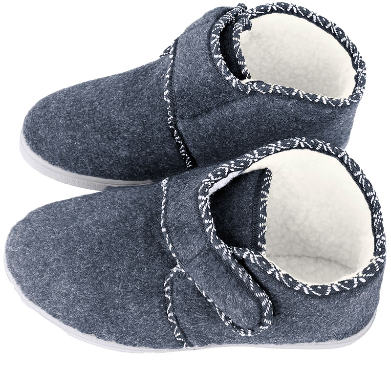 Tieto dámske papuče tmavé sú ideálnou voľbou pre tých, ktorí potrebujú nové komfortné papuče na doma aj do vonkajšieho prostredia. Vonkajšia, takisto ako aj vnútorná strana kapcov je obalená do príjemného filcového materiálu, ktorý je jemný na dotyk s nohou. Filcové kapce pre seniorov sú kvôli ich hrubšiemu prevedeniu vhodné do prechodných či chladných mesiacov v roku. Zapínanie tejto obuvi funguje na základe suchého zipsu. Podrážka papúč je vyhotovená z polyuretánu, ktorý vytvára stabilitu aj pevnosť obuvi. Tieto dámske kapce sú tak kvalitnou obuvou ako aj vhodným darčekom pre seniora, ktorý potrebuje poriadnu obuv.
