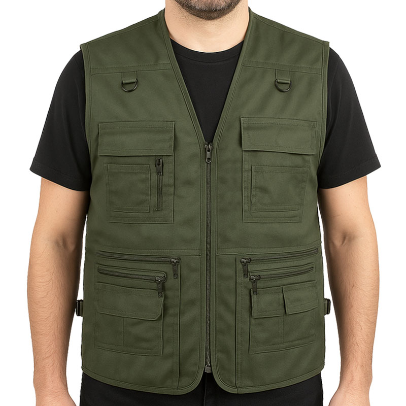 Pánska zelená rybárska vesta je ideálnym spoločníkom pre každého, kto potrebuje mať všetko dôležité vždy poruke. Vesta ponúka až 13 praktických vreciek – 5 so zapínaním na suchý zips, 7 na klasický zips a 1 vrecko s klopňou, ktoré poskytujú dostatok priestoru na drobné vybavenie, náradie, mobil, doklady či rybárske doplnky.