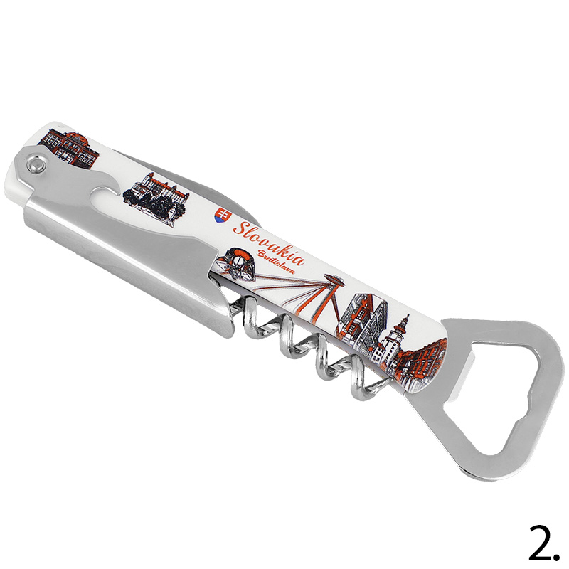 Praktický otvárač na víno spolu s otváračom na fľaše, na ktorom sa nachádzajú slovenské motívy. V zloženom stave má otvárač rozmery 13,5 x 4 x 1,5 cm.