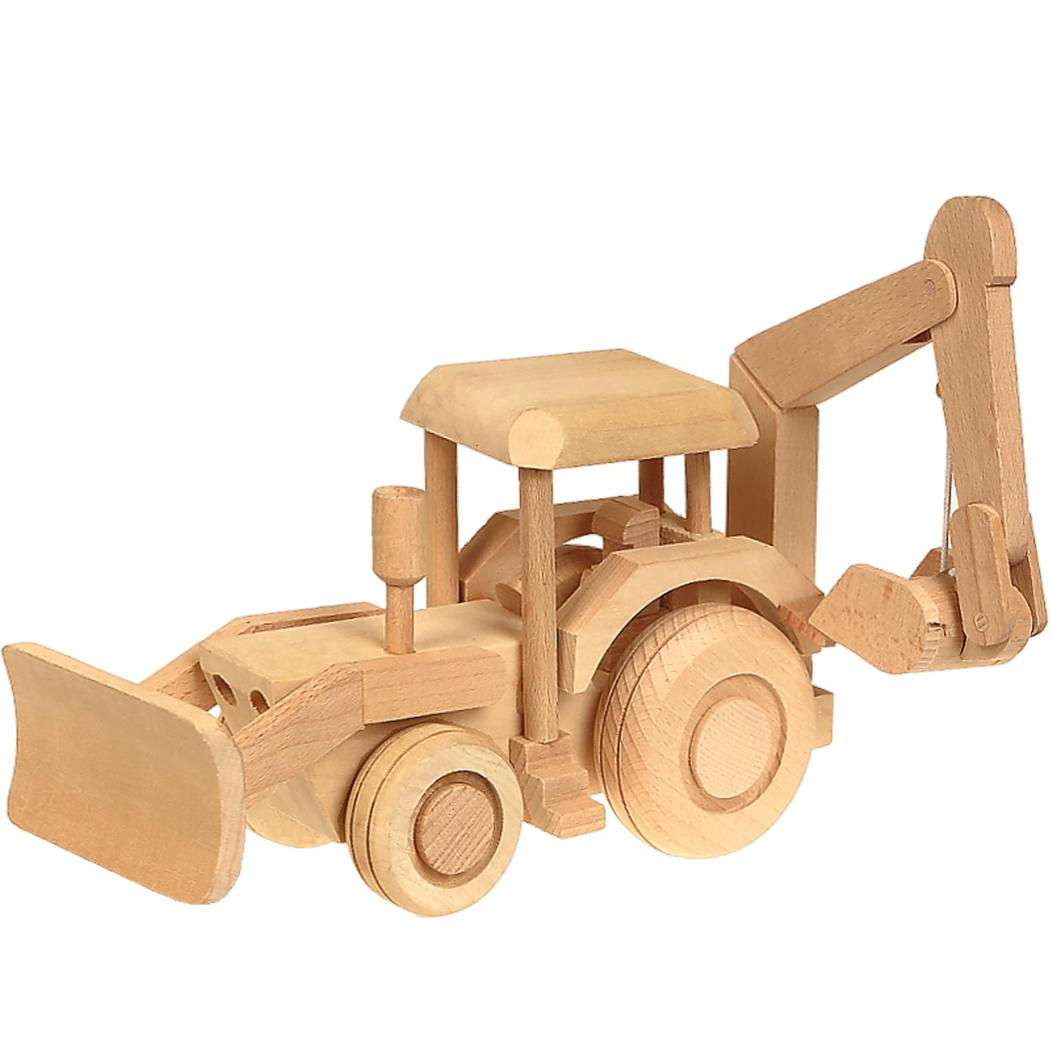 Drevený bager s pohyblivými lyžicami je zábavná drevená hračka pre deti ale aj bytová drevená dekorácia. Pohyblivé kolesá, lyžice a ramená zabavia deti na dlhé chvíle a detičky môžu zakomponovať tento bager do rôznych hier. Predná lyžica sa hýbe smerom hore-dole, zatiaľ čo v prípade zadnej lyžice sa hýbe rameno bagra do strán taktiež zhora dole. Drevený bager pre deti je milý darček pre dieťa každého veku, no poslúžiť môže aj ako drevená dekorácia.