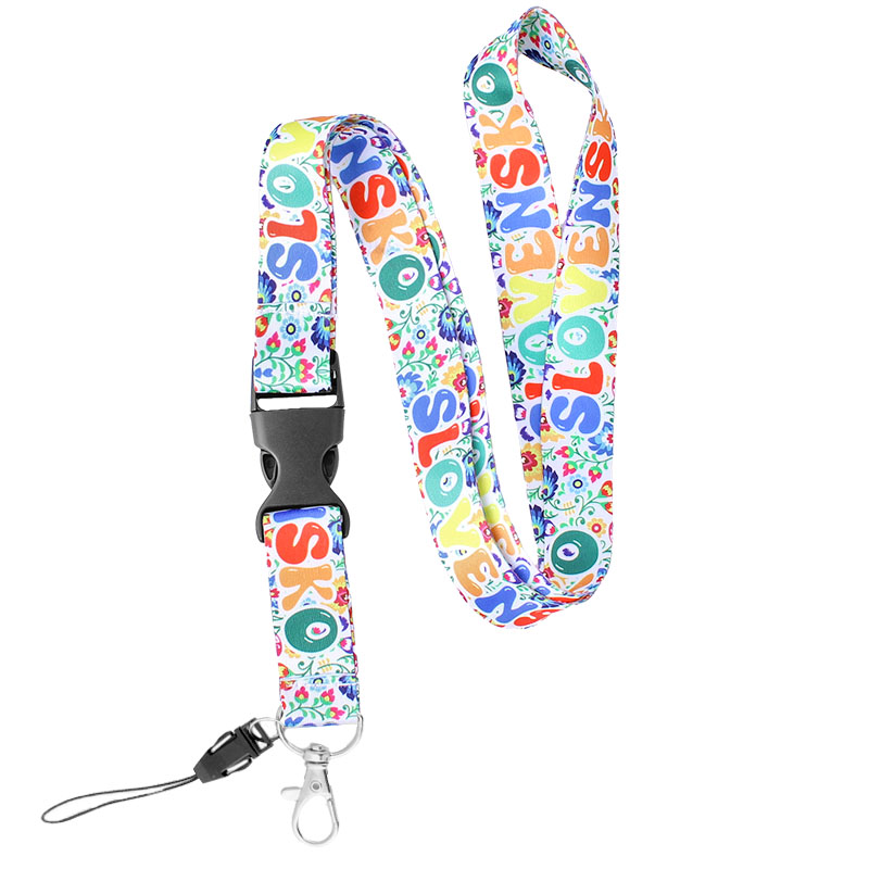 Hebká šnúrka pre kľúče s mini karabínkou a menšou plastovou sponou. Dĺžka šnúrky od krku je cca 49 centimetrov a na konci je doplnená o plastovú sponu pre oddelenie šnúrky od kľúčenky.