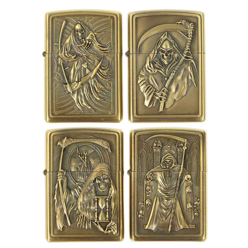Štýlové zapaľovače v darčekovom balení z mosade s dizajnom smrtiek. Benzínové zapaľovače potešia každého muža alebo aj ženu v podobe praktického darčeka pre fajčiara. Korektne fungujú vo vnútornom aj vonkajšom prostredí, kde zvyknú byť zhoršené poveternostné podmienky. Z bezpečnostných dôvodov sú tieto zapaľovače nenaplnené benzínom. Dodávané sú v balení kazetového tvaru.