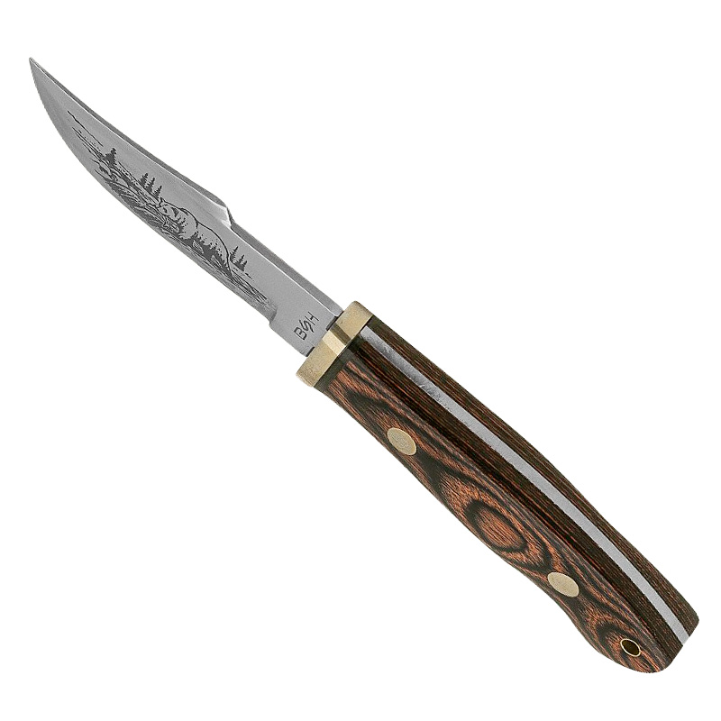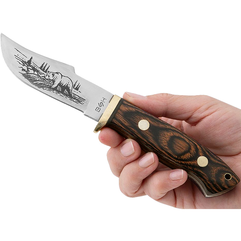 Malý, ale mimoriadne robustný lovecký nôž, ideálny pre tie najnáročnejšie úlohy. Nôž sa vyznačuje full-tang konštrukciou, ktorá poskytuje maximálnu odolnosť voči poškodeniu. Monolitická časť rukoväte a čepeľ v tvare bowie sú vyrobené z vysoko kvalitnej nehrdzavejúcej ocele 420. Čepeľ je na oboch stranách zdobená obrázkom medveďa. Lovecký nôž má ergonomickú a veľmi pohodlnú rukoväť s drevenými šupinami. Kovová záštita zabraňuje náhodnému skĺznutiu ruky smerom k ostriu. Lovecký nôž má v zadnej časti otvor na zavesenie šnúrky alebo kľúčenky. Súčasťou je klasické čierne puzdro z Cordury, ktoré je možné pripevniť na opasok. Jedná sa o perfektný darček pre poľovníka, skauta, rybára alebo akéhokoľvek outdoorového nadšenca.