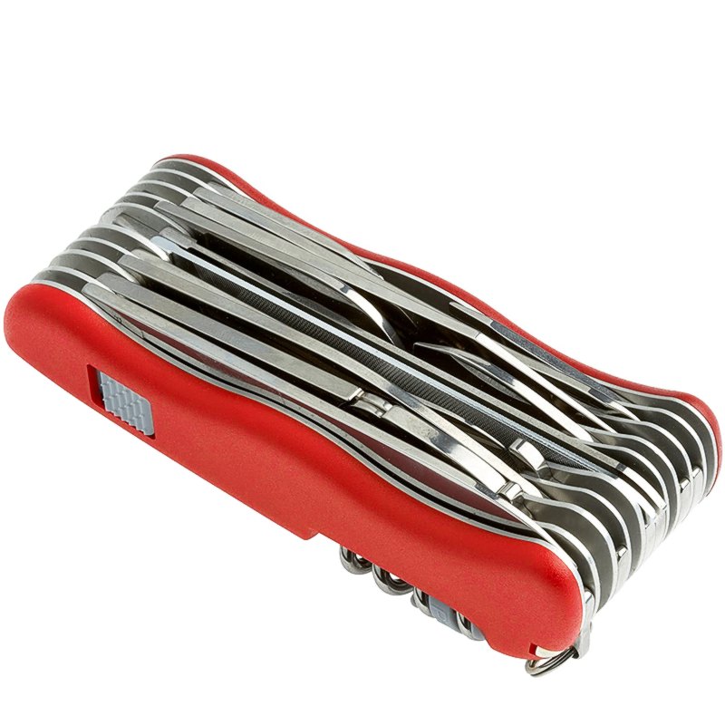 Na tomto noži nájdete: hlavnú veľkú zatváraciu čepeľ s dĺžkou 86mm, ktorá je zabezpečená poistkou proti nechcenému uzavretiu, otvárak na fľaše spolu so skrutkovačom 5mm a s odstraňovačom izolácie drôtov. Otvárak na konzervy spolu so skrutkovačom 3mm, ktorý možno využiť aj ako krížový. Ďalší mini skrutkovač nájdete ešte dômyselne uložený vo vývrtke na zátkové uzávery. Na noži nájdete ešte pevný dierovač - výstružník, nožnice a kliešte na strihanie a ohýbanie drôtov. Spolu na nástroji pilník je aj pílka na železo. Ďalšími nástrojmi na noži sú dvojradová pílka na drevo, krížový skrutkovač malý a krížový skrutkovač veľký. Súčasťou vybavenia je ešte plastové špáradlo, kovová pinzeta a krúžok na kľúče. Oceľová pinzeta a plastové špáradlo sú dômyselne ukryté v črienke v mieste pri krúžku na kľúče.