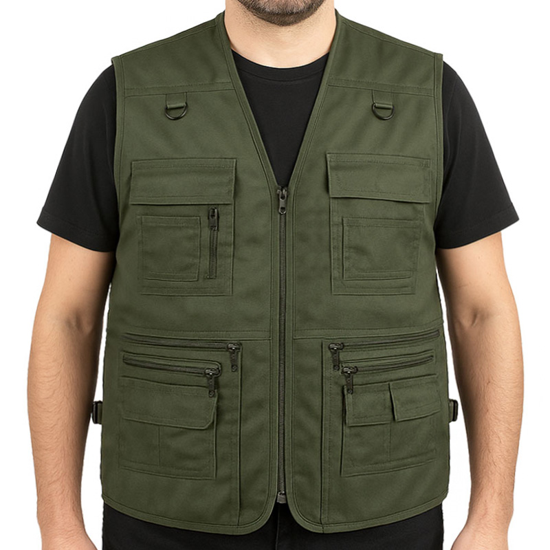 Pánska zelená rybárska vesta je ideálnym spoločníkom pre každého, kto potrebuje mať všetko dôležité vždy poruke. Vesta ponúka až 13 praktických vreciek – 5 so zapínaním na suchý zips, 7 na klasický zips a 1 vrecko s klopňou, ktoré poskytujú dostatok priestoru na drobné vybavenie, náradie, mobil, doklady či rybárske doplnky.