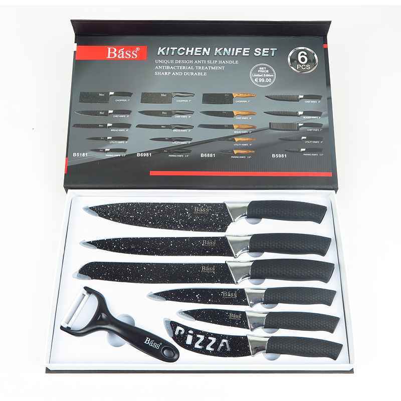 špecifikácia: sada nožov s mramorovým povrchom čepele s jedinečným dizajnom sa skladá zo šiestich ostrých a odolných kuchynských nožov rozličných veľkostí a škrabky na zemiaky s keramickým nožom