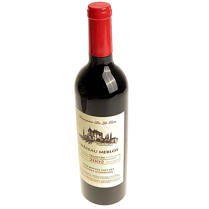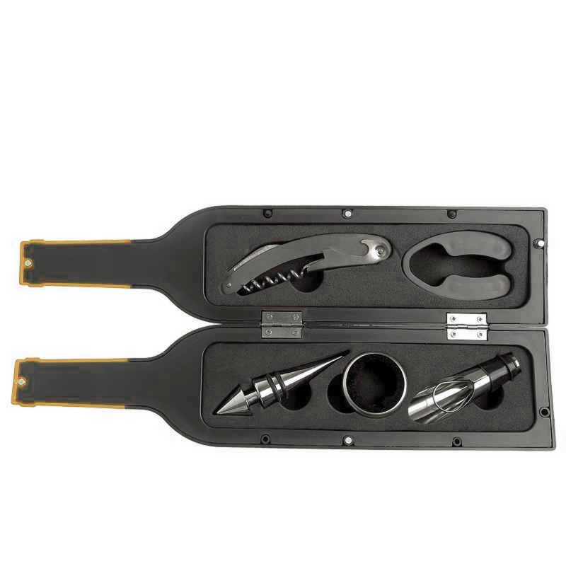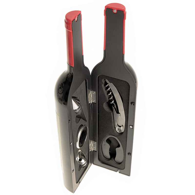 Exluzívna darčeková fľaša, ktorá skrýva vo svojom vnútri sadu piatich vinárskych pomôcok ako sú antikorová zátka, otvarák, nálievka, krúžok na hrdlo fľaše, noží s vývrtkou a otvarákom na fľaše. Ide darček vhodný pre všetkých milovníkov dobrých vín a samozrejme aj ako dekoračný predmet do domácnosti, alebo reštaurácie.