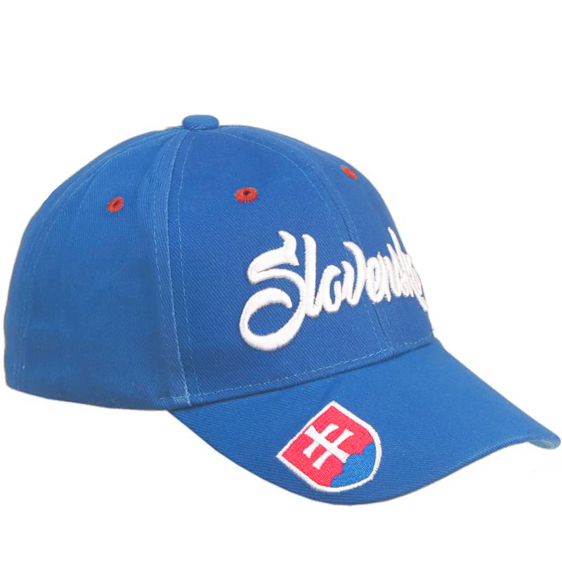 špecifikácia: jednoduchá modrá čiapka s tvrdým šiltom a v prednej časti s vyšitým nápisom Slovensko a so slovenským štátnym znakom