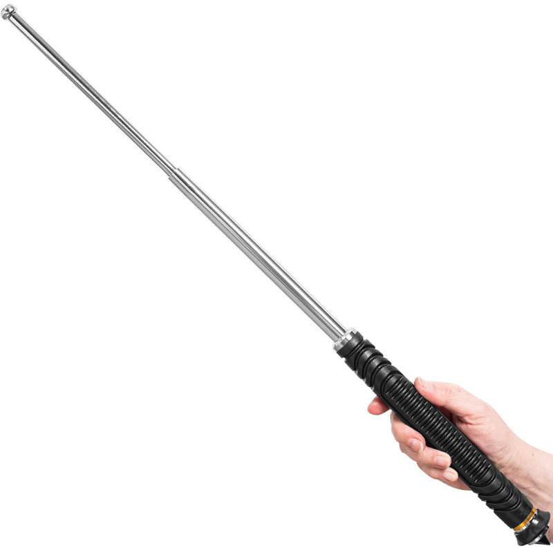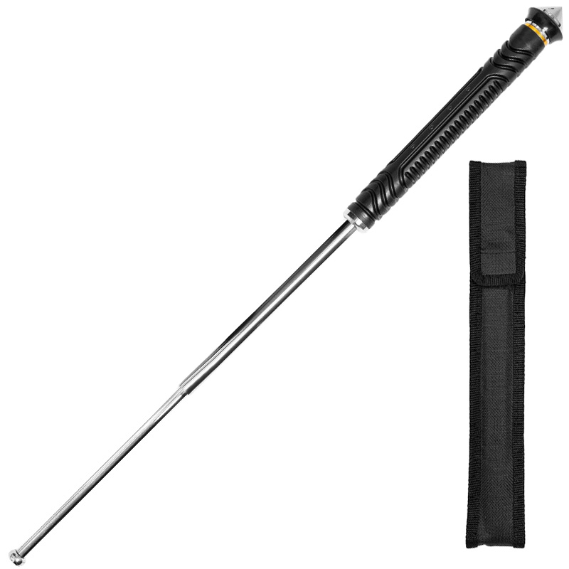 Obušok je všestranný nástroj určený na sebaobranu, ktorý si cenia uniformované služby, odborné služby a bezpečnostné agentúry. Tento model sa vyznačuje nielen efektívnym spracovaním ale aj výbornou funkčnosťou v núdzových situáciách, a to vďaka solídnej výbave na konci obušku - hrotom, ktorý umožňuje rozbíjať sklo, ľad a iné tvrdé povrchy. Vyklápacie prvky obušku sú chrómovej farby, čo mu dodáva nielen elegantný vzhľad, ale zaisťuje aj vysokú odolnosť proti oderom a poškodeniu spôsobenému nárazmi. Ergonomická rukoväť z protišmykovej syntetickej gumy s početnými drážkami zaisťuje pohodlné uchopenie a účinne zabraňuje skĺznutiu ruky aj pri intenzívnom používaní. Balenie obsahuje aj odolný čierny poťah z cordury, ktorý sa dá pripevniť na opasok nohavíc, čo uľahčuje nosenie obušku.