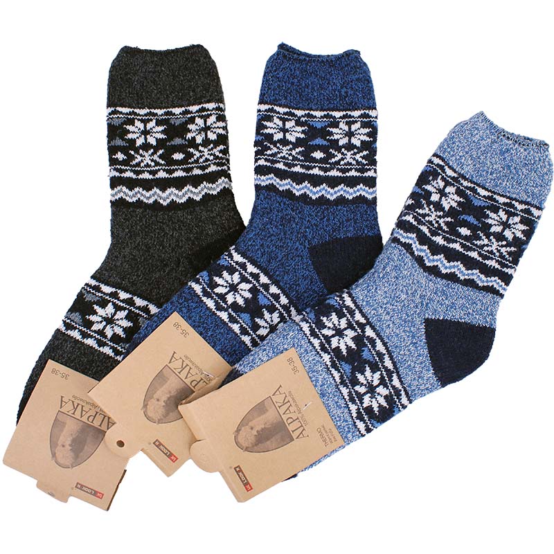 Popis: Dámske zimné ponožky vyrobené z kvalitnej ovčej vlny druhu Alpaka, ktorá zaručuje pohodlné nosenie aj po celý deň. Ponožky sú hrubé a kvalitné, vhodné hlavne počas chladných a zimných dní. Prispôsobia sa vašej nohe a majú voľný neškrtiaci lem bez gumy (zdravotné ponožky) V ponuke je Krásny Nórsky vzor Vločka a rôzne farebné prevedenia s vločkami. Vhodné aj ako praktický a lacný darček pre ženu.