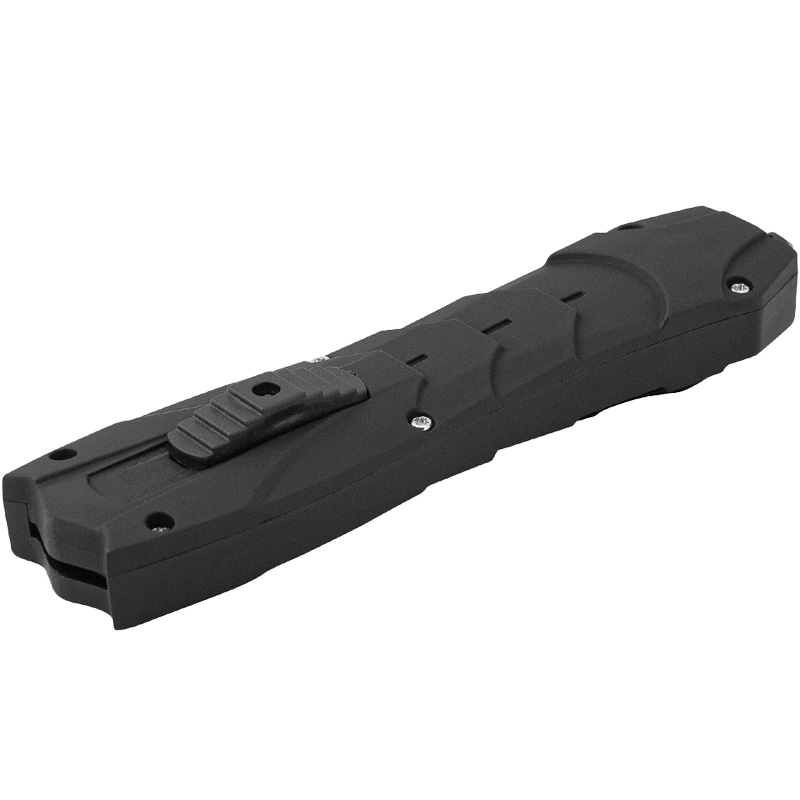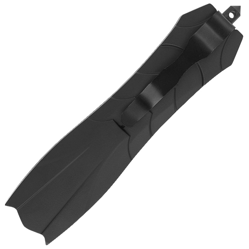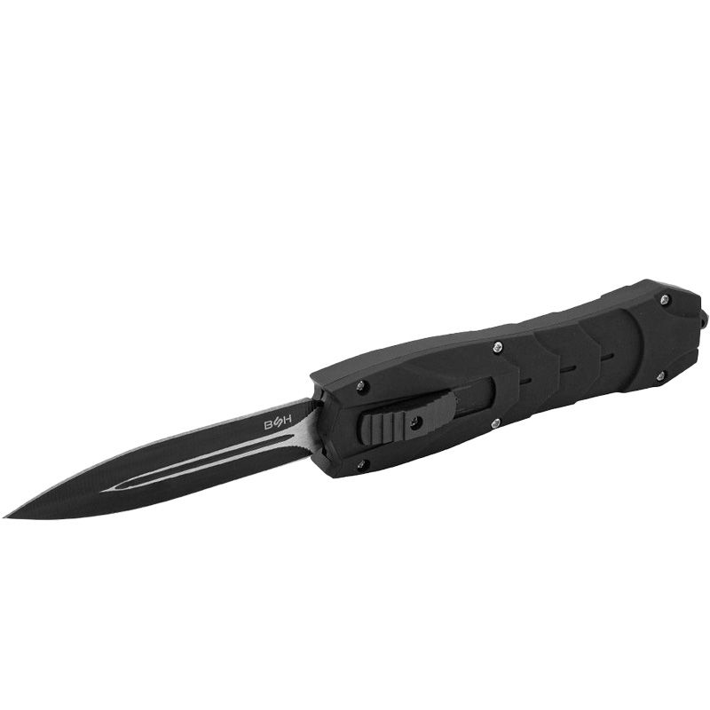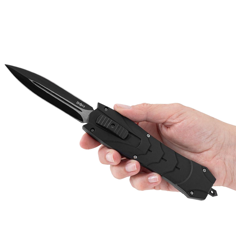 Pružinový nôž OTF (Out The Front) s čepeľou s predným vyskakovaním. Tento model má čepeľ, ktorá sa automaticky vysúva a zasúva do rukoväte, čo zaisťuje pohodlie a rýchlosť. Nôž má obojstrannú dýkovú čepeľ, ideálnu pre presné rezy. Štýlová čierna povrchová úprava mu navyše dodáva jedinečný a moderný vzhľad. Zárezy pozdĺž rukoväte zlepšujú úchop. Rukoväť je elegantná a ergonomická, čo zaisťuje bezpečný úchop a pohodlie pri používaní. Veľká spona umožňuje jednoduché pripevnenie noža na opasok alebo do vrecka. Na otvorenie noža jednoducho posuňte posúvač na rukoväti nahor. Na zatvorenie čepele posuňte posúvač nadol. Silný a presný mechanizmus zaisťuje spoľahlivú prevádzku v každej situácii.